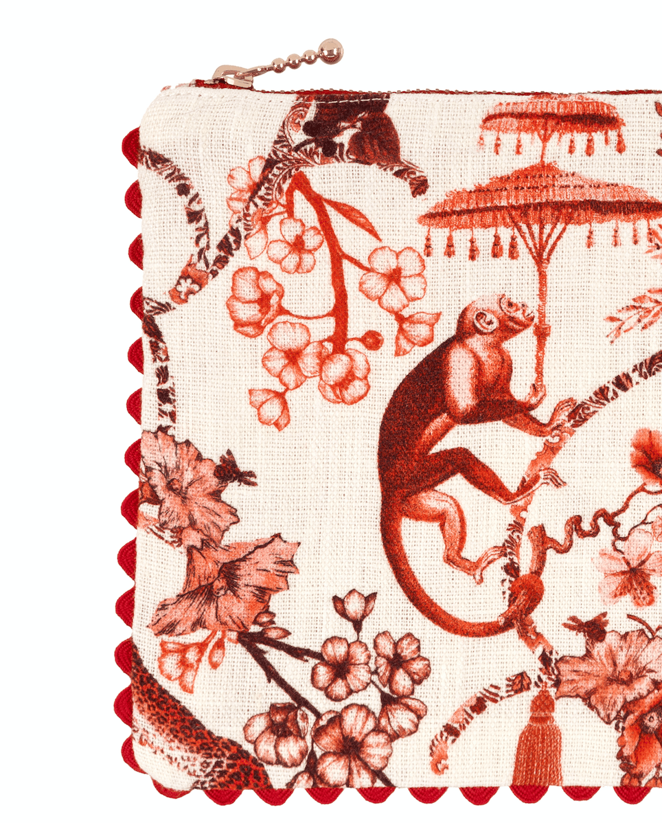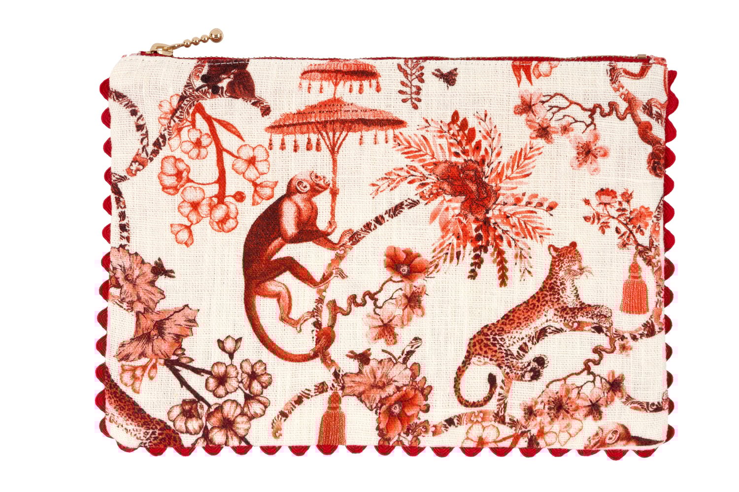 An exclusive printed linen pouch with sartorial details, golden metal zip, inside pocket and finished with trimmings.