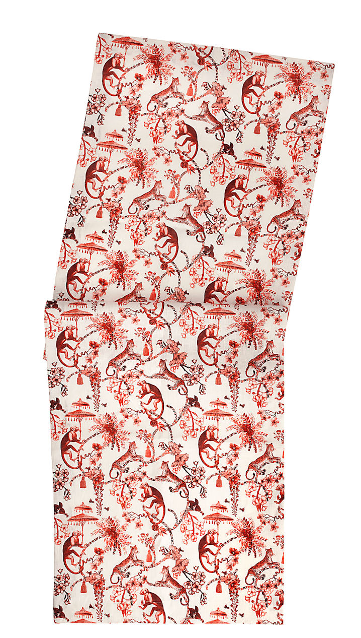Runner da tavola sartoriale in lino stampato con una Toile de Jouy d'ispirazione orientale, un disegno esclusivo Milou Milano. Una giungla esotica tra palme, fiori, divertenti scimmie e regali tigri che reinterpreta in chiave moderna il classico motivo Chinoiserie delle antiche porcellane cinesi. Un mondo incantato per vestire le tavole con uno stile non troppo formale ma sempre elegante.