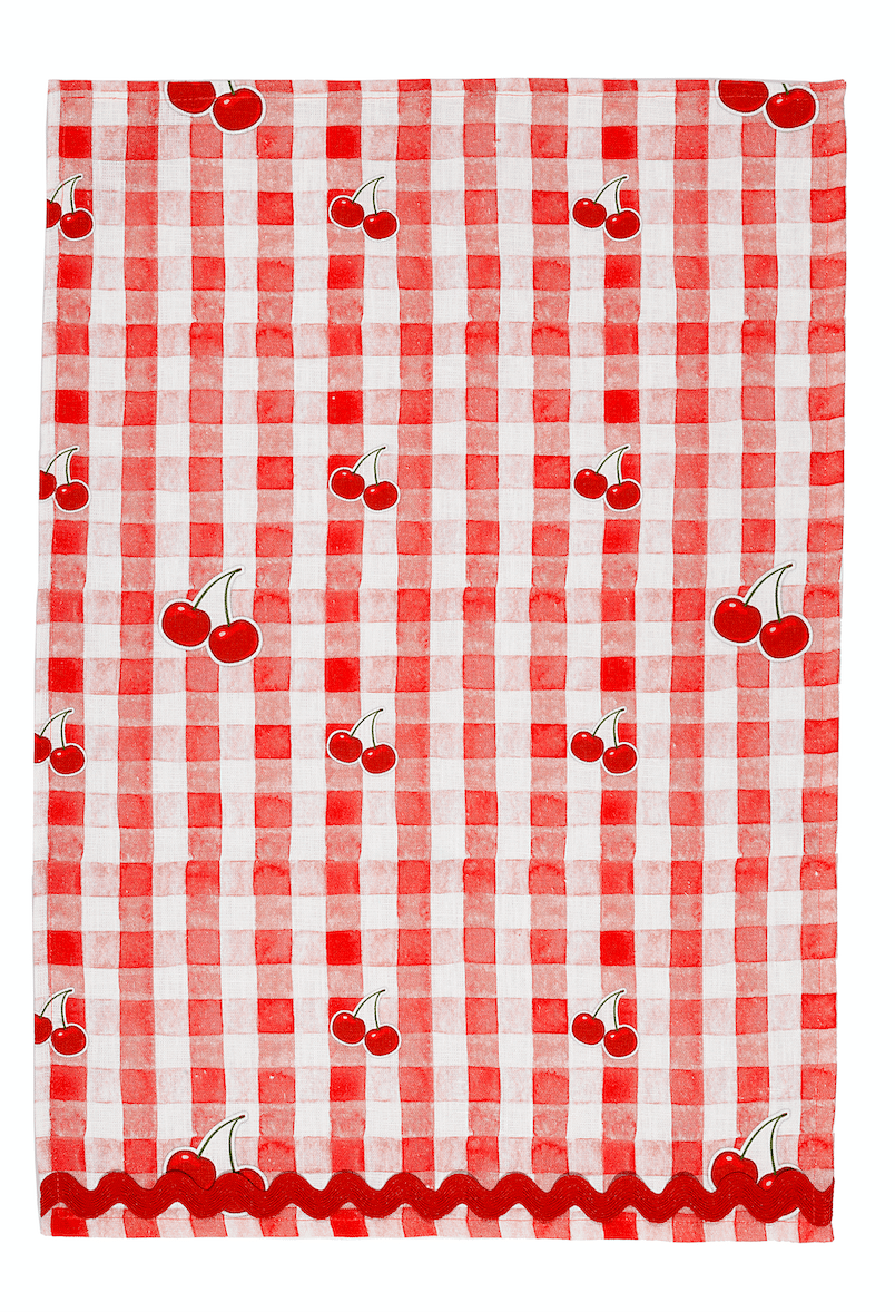 Pure linen tea towels with an exclusive design by Milou Milano. For a tea towels collection with personality, with a pop ultra trendy and classic red Gingham motif, with a cherry stamp and a ric-rac trim. Think brunch , think picnic, think casual dinner party, or just think they look great on your kitchen! An exclusive design by Milou Milano.