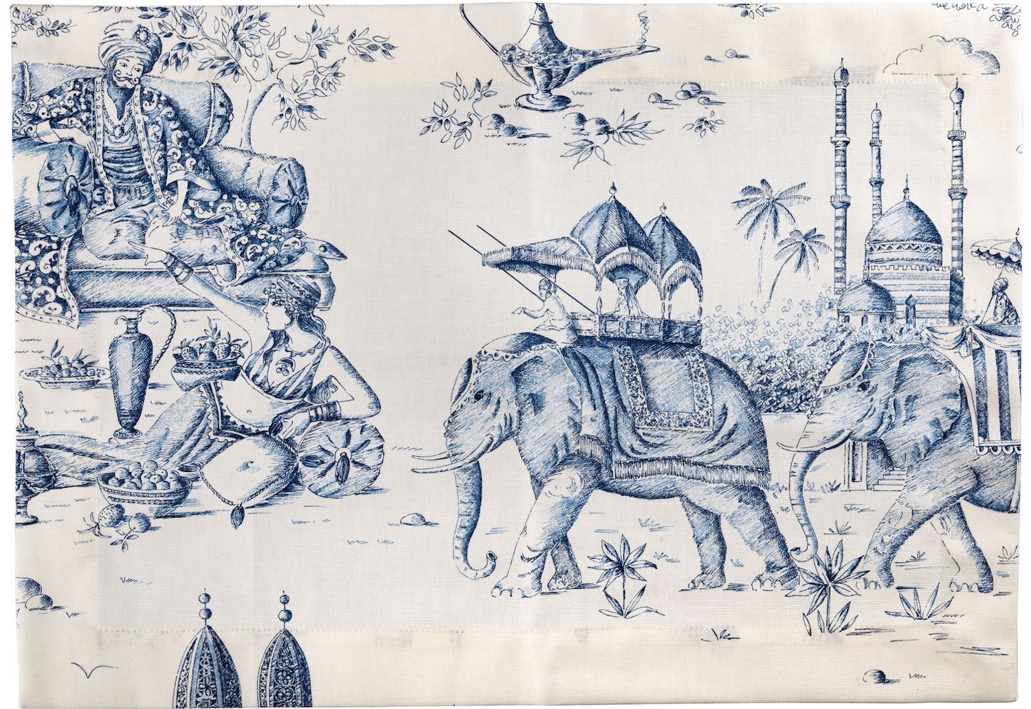 Un viaggio tra l’India e la Persia alla scoperta di tesori, misteri e magie. Una Toile de Jouy in bianco e blu con scene di principesse, sultani, tesori e lanterne di Aladino! Set di 2 tovagliette.